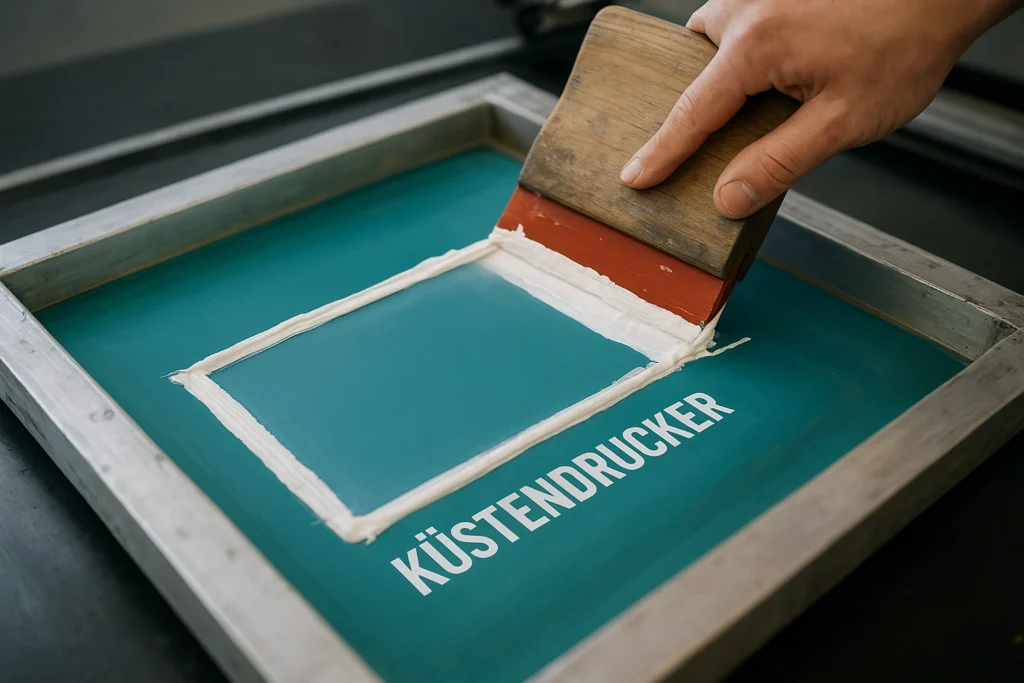 Der Siebdruck ist das hochwertigste Verfahren für große Stückzahlen. Dabei wird die Farbe mit Druck durch ein feinmaschiges Sieb direkt auf den Stoff übertragen – extrem langlebig und farbstabil.